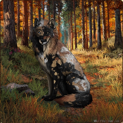 Base Coat: Obsidian (Common) Eyes: Blue-Brown (Common) Nose: Black (Common) Leg Type: Stripes Leg Color: None Muzzle Type: None Muzzle Color: Grey Harlequin: Tan Back Type: Dapple Back Color: White Back Type #2: Spike Back Color #2: None Piebald 1: White Speckle Type: Shoulder Speckle Color: None Ear Edges Type: Full Ear Edges Color: None |