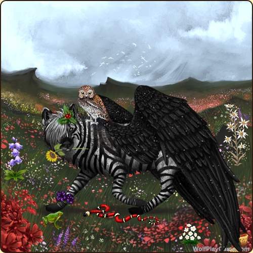 Base Coat: Zebra (Legendary) Eyes: Gold (Common) Nose: Black (Common) Inner Ears: Obsidian Leg Type: Frosted Leg Color: Obsidian Head Type: Tears Head Color: Obsidian Tail Type: Tip Muzzle Type: Stripe Muzzle Color: None Back Type: Sooty 2 Back Color: Black Brindle: Obsidian Piebald 3: White Ear Edges Type: Tip Ear Edges Color: White |
