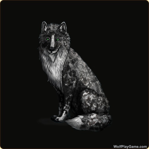 Base Coat: Black (Common) Eyes: Green (Common) Nose: Black (Common) Inner Ears: White Leg Type: Rainkissed Leg Color: White Head Type: Throat Head Color: White Tail Type: Tip Muzzle Type: Stripe Muzzle Color: White Harlequin: Obsidian Somatic Mutation: Obsidian Back Type: Dapple Back Color: White Back Type #2: Sooty 2 Back Color #2: None Shoulder: Obsidian Brindle: Blue Belton: Blue Leopard: White Speckle Type: Full Speckle Color: Silver Ear Edges Type: Tip Ear Edges Color: Silver |