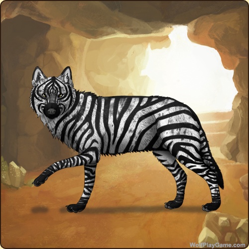 Base Coat: Zebra (Legendary) Eyes: Yellow (Common) Nose: Dark Grey (Rare) Leg Type: Mitts Leg Color: None Head Type: Tears Head Color: None Tail Type: Full Muzzle Type: Wide Muzzle Color: None Belton: Obsidian |
